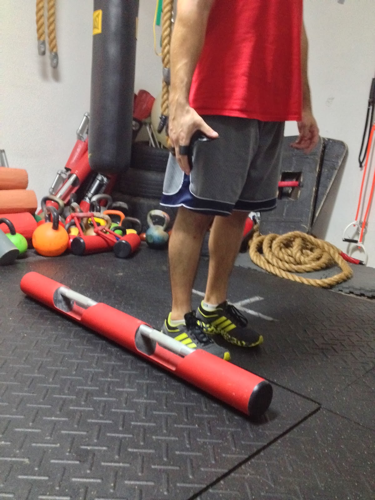 Squeeze your glutes, press your left foot into the ground and stand up tall, locking your glutes at the top. Do not allow the long end (which is now behind you) of the Nabard device to dip down. With this, the long end is placing downward force on your hand and wrist, in the direction of radial deviation. To maintain neutral wrist position, you must fire your ulnar deviators as well as maintain a crushing grip on the handle due to the increased diameter from the Neurogrips. This will work your hand, wrist, forearm, elbow, shoulder and trunk musculature. To see how much of a challenge Neurogrips provide, try one set with and the next set without the Neurogrips on.